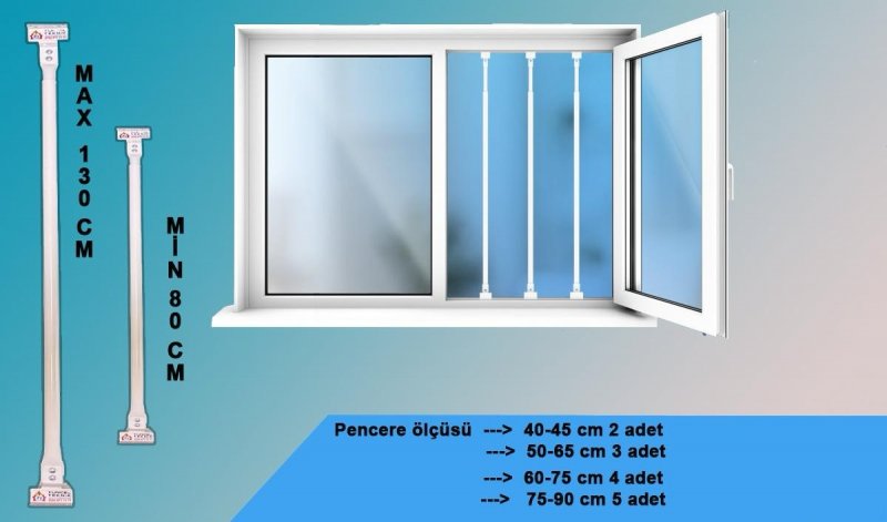 19 x1 mm 75 cm kutu profil içerisine 16x1,5 mm 75 cmlik kutu profil girmekte olup 85 cm’den 135 cmye kadar pencerelere monte edilebilmektedir. Pencere ölçüleri standart olmadığından uzayıp kısalabilen şekilde tasarlanmıştır. Montajı son derece kolaydır. Hem kasa içine hem kasa dışına montaj yapmaya uygundur.